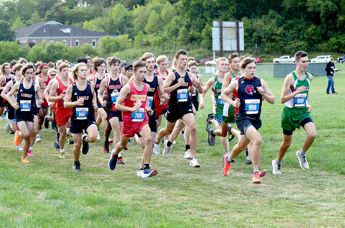 OFF TO THE RACES — The field files onto the course at the start the boys portion of the OVCCL kick off meet at Buckeye Local Tuesday. – Andrew Grimm