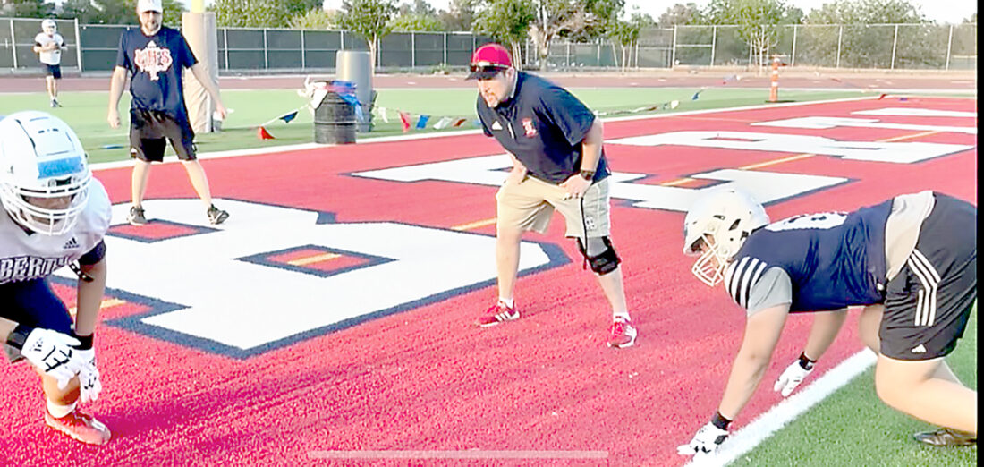 COACH WITH LOCAL TIES — George Baker coaches a drill during a practice at Liberty High School in Las Vegas. Baker, a Mingo High School graduate, has been coaching in Nevada since 2005 after a local career at Mingo and Buckeye Local. One of his former players at Liberty, Troy Fautanu, was selected by the Steelers in the NFL Draft. – Contributed