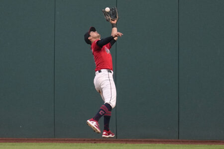 Cleveland Guardians right fielder Tyler Freeman catches a fly ball hit by New York Mets’ Jeff McNeil during the eighth inning of a baseball game Tuesday, May 21, 2024, in Cleveland. (AP Photo/Sue Ogrocki)