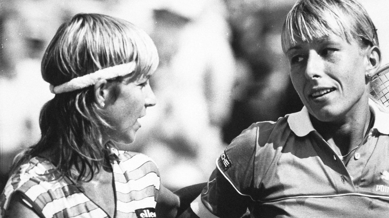 In this July 4, 1985, file photo, Chris Evert, left, and Martina Navratilova joke with Police Constable Les Bowie on Number Two Court at Wimbledon. Credit: AP/DAVE CAULKIN