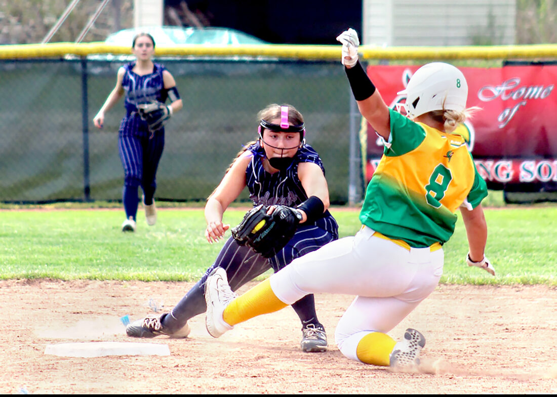 SAFE — Conotton Valley’s Tiffany Donato gets her foot in under the tag of Madonna second baseman Mia Pietranton. — Mike Hughes